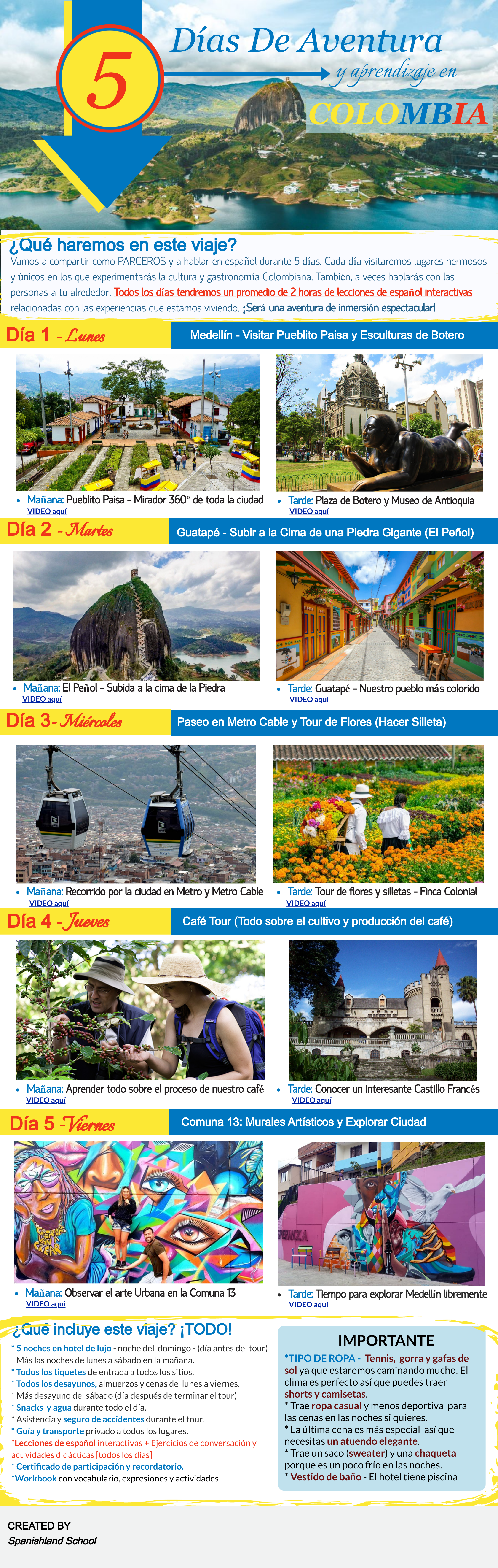 All inclusive 5 days, 6 nights Spanishland School Tour. You just pay airfare to & from Medellín.